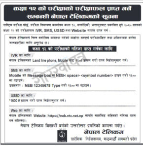 नेपाल टेलिकमले आइभिआर, एसएमएस, युएसएसडी र वेबसाइटमार्फत परीक्षाफल प्राप्त गर्न सकिने जनाएको छ ।