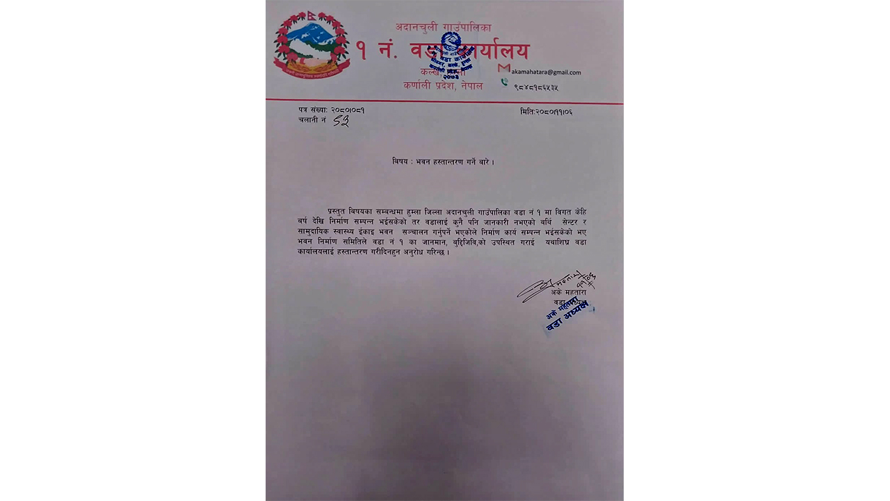 वडाध्यक्ष महताराले कामदारलाई पारिश्रमिक बितरण गरी यथाशिघ्र भवन वडालाई हस्तान्तरण गर्न सम्बन्धित उपभोक्ता समितिलाई निर्देशन दिईसकेका छन् ।