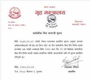 गृह मन्त्रालयका सहसचिव रुद्रप्रसाद पण्डितले आज एक विज्ञप्ति सार्वजनिक गर्दै नेपाल राजपत्रमा प्रकाशित सूचनाअनुसार भोलि सार्वजनिक बिदा दिने निर्णय भएको बताएका छन् ।