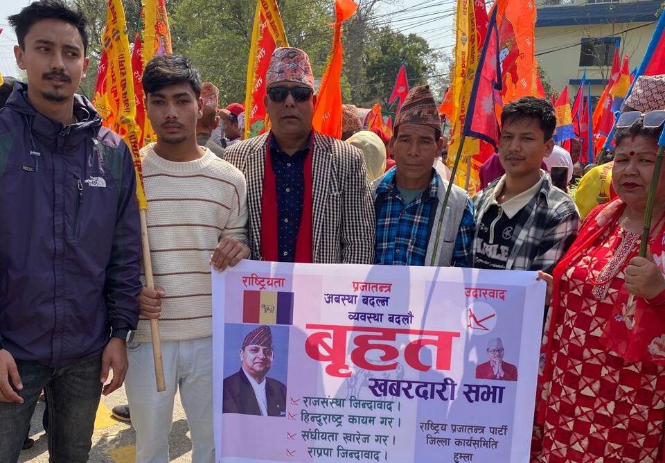 सुर्खेत । सोमबार मोटरसाइकल काठमाडौँमा र्याली गरेको राष्ट्रिय प्रजातन्त्र पार्टी (राप्रपा) ले मंगलबार सुर्खेतमा खबरदारी सभा गरेको छ। वीरेन्द्रनगरस्थित पिपलचौतारामा सडक कब्जा गरी राप्रपाले सभा गरेको हो।